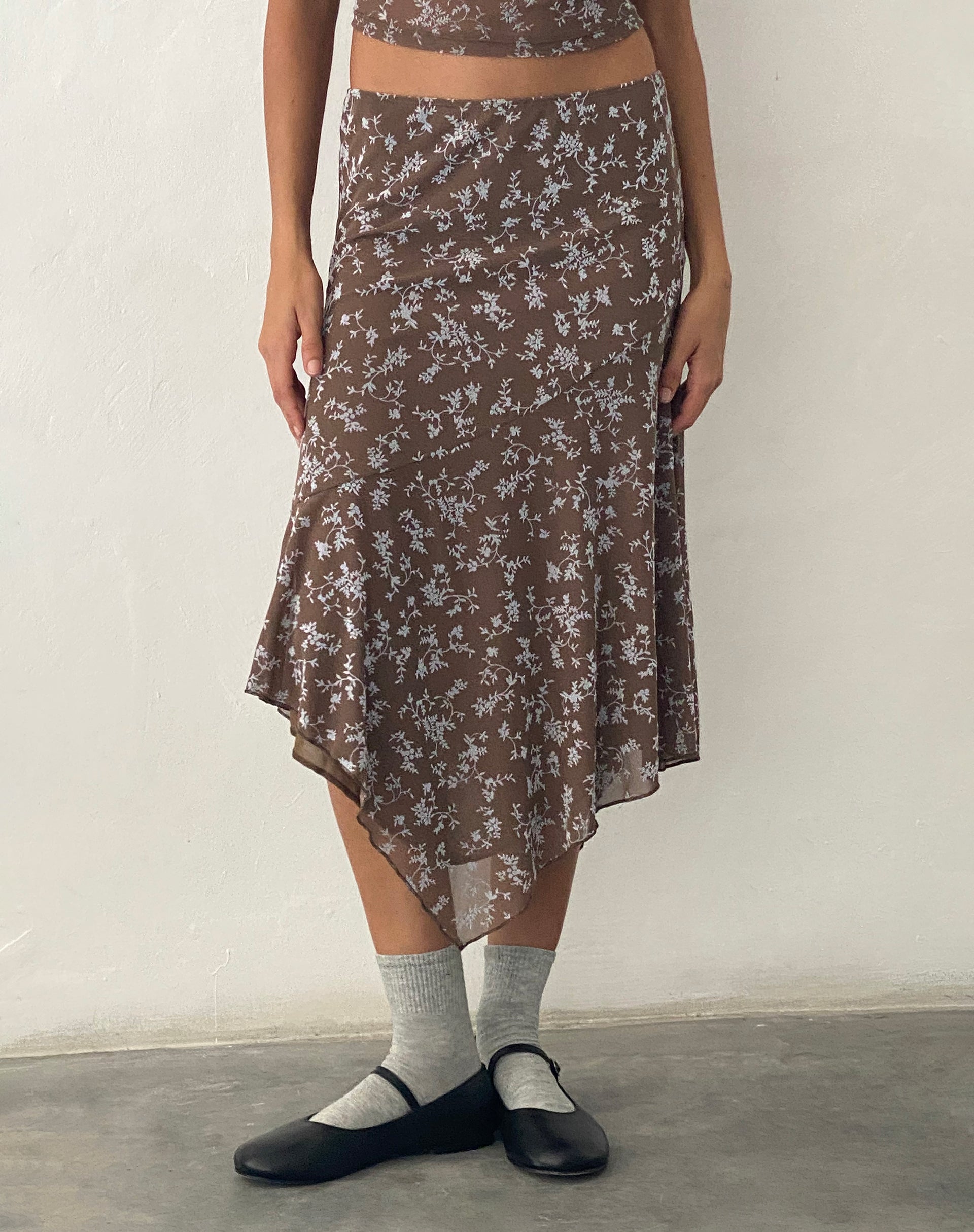 The skirt every wardrobe needs. Our Cinta skirt in dark taupe. features a midi length waterfall hem and a low rise fit in a flocked mesh fabric. Match it up with our Aerin top.