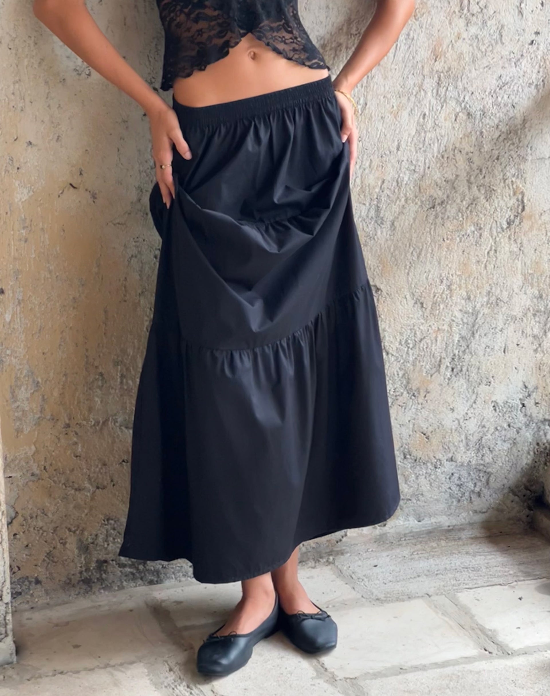 The must-have skirt for this season. Remax. in black. features a tiered hem design and maxi length. We love to style with the Nobila shrug.